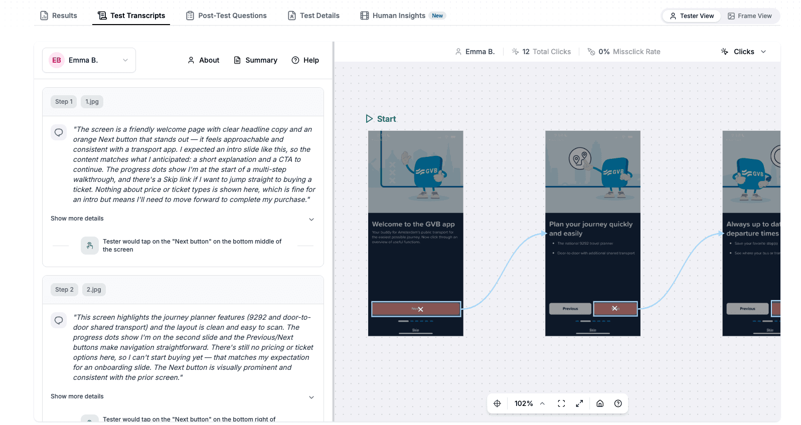 All of this is displayed in the Transcripts view, so you can clearly see what the tester did, what they were thinking step by step.