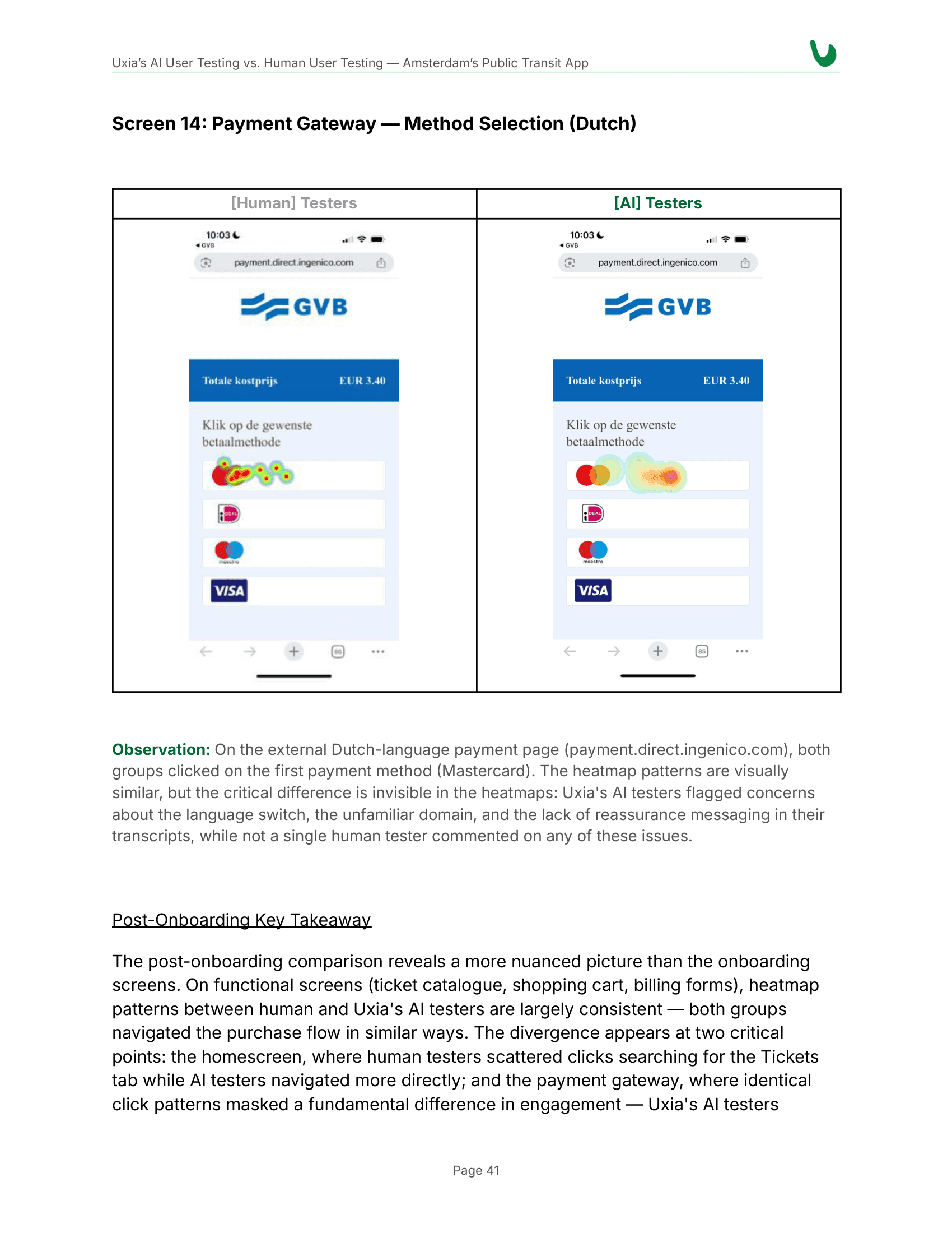 Critical "Blind Spots": All 10 AI testers flagged a serious trust issue regarding an external Dutch-language payment redirect. In contrast, not a single human tester commented on it, likely because they were rushing to complete the task for compensation.